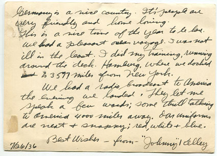 Johnny was the favorite in the 1936 Boston Marathon, but Tarzan Brown won, earning a spot on the Olympic team. Johnny finished fifth and had to run again in D.C., thirty days later. It would not surprise me if he stayed in Washington for this marathon with the recipient of the first postcard. Johnny finished second and was on his way to Berlin.